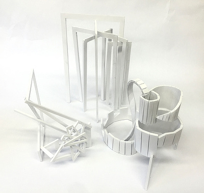 In this photo of white 3D structures, the white backdrop makes the contrast of the photo very low, making it difficult to see the shapes of the sculptures clearly.