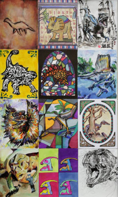 In the image on the right, it’s very obvious that the assignment was for the student to take one subject (in this case, a dinosaur) and to draw variations of that subject using different art media and art styles, some of which are based on art historical movements within the context of a 3 x 4 grid.