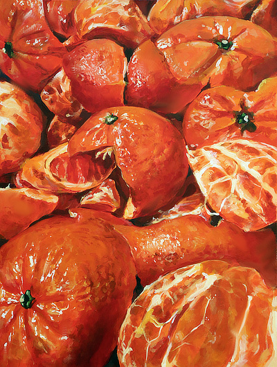 This painting on the right of oranges is beautifully painted: the painting has gorgeous details, the texture of the oranges is really well captured, the contrast is excellent, and the highlights on the oranges seem to glisten in the light.