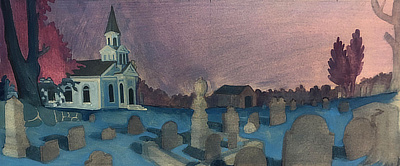 In this gouache painting tutorial, Teaching Artist Alex Rowe chooses a color scheme that is largely cool colors, using purples and maroons for trees and blue tones for the grass in a graveyard.