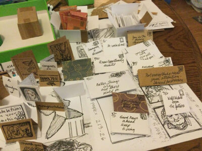 Materials are recycled junk mail, index cards, brown paper bags, Magic Tail gel pen and colored pencils. The project also inspired redesigning my calling card as a match box with my email on the back of the match sticks.