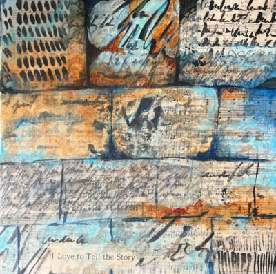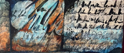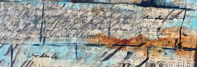 The inked papers were ripped and adhered over the top of my substrate (Claybord) that was covered with vintage sheet music. Because text is an integral part of my story, although illegible, the entire piece is a mashup of song lyrics that when pieced together, resembles warm bricks, each one containing notes that signify some abstract piece of a story.