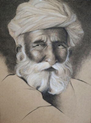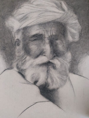 Initial layers established with vine charcoal and some final touches with compressed charcoal. Portrait is of a Rajasthani man with turban and short kept beard.”