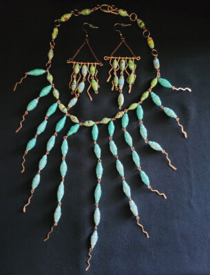 I wanted to challenge myself to try something new. The pieces include handmade paper beads with hammered copper inspired by a recent trip to Niagara Falls.