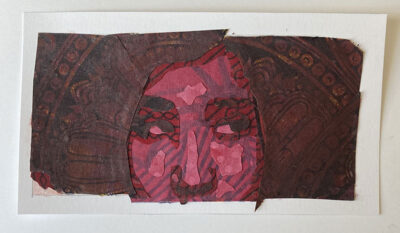 I took photos taken of me and cropped them to focus on my eyes and eyebrows. I simplified the photos to just four values each. Then I used acrylic paint to recolor scrap fabrics from previous sewing projects in each of the four values.