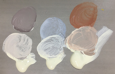 On your freezer paper, mix shadow tones. For each blocked shape on your canvas, take a small amount of one of your white mixtures and mix it with a bit of raw sienna and ultramarine blue.