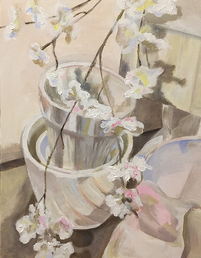 “Layering a white pot with a white cup on top of a white background forced me to look harder at what I was seeing and question it. It made me see color in the different objects and their relationships to the others in ways I didn’t really pay attention to before. I started painting with darker more exaggerated colors because it made it easier for me to bring out certain objects. But I think something I could’ve altered was the amount of exaggeration just because I think it changed the way the still life actually looks.
