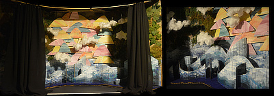 The lighting on the artwork is too stark and harsh, therefore the black curtains on the sides of the artwork sink into the background and are tough to see.
