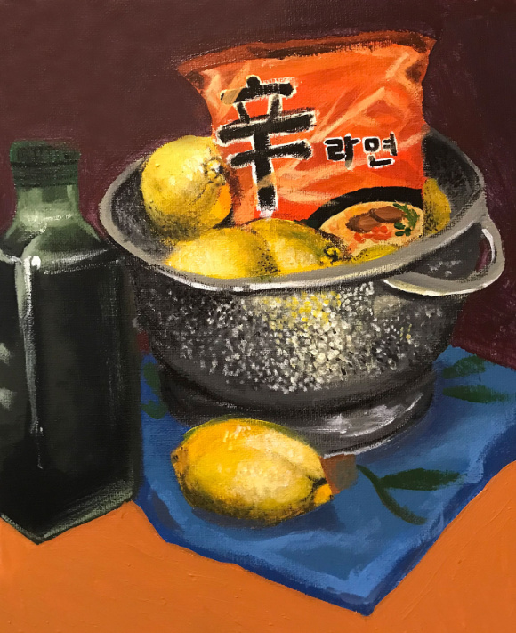 The color of the oranges is really monotonous throughout the entire painting. What if there was a slight hint of cerulean blue in one of the shadows of the oranges? What if there was a glaze of purple in another shadow?