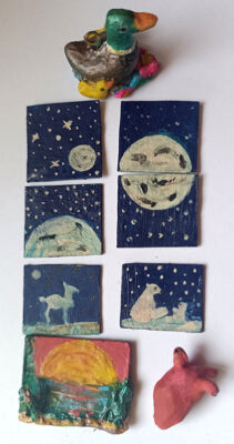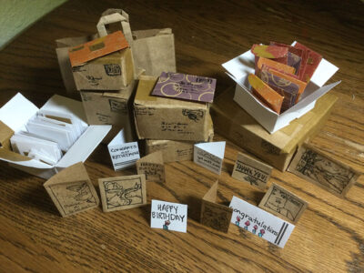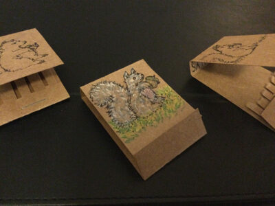 Materials are recycled junk mail, index cards, brown paper bags, Magic Tail gel pen and colored pencils. The project also inspired redesigning my calling card as a match box with my email on the back of the match sticks.