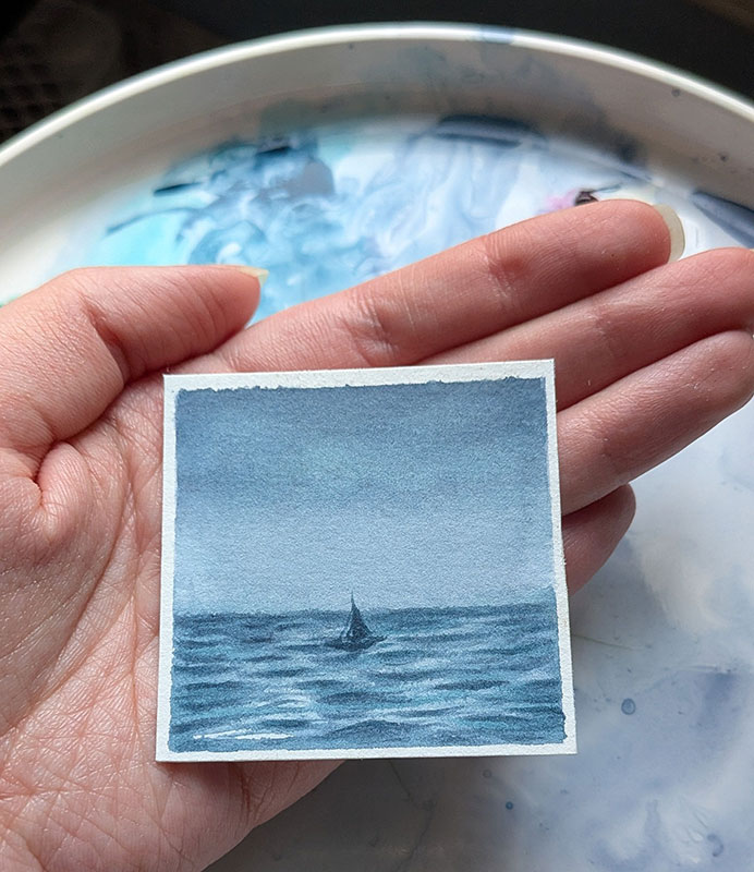 To maintain the magnitude of space around the boat at such a small scale I had to carefully go in with a tiny lettering brush to add the sailboat and ripples in the water.