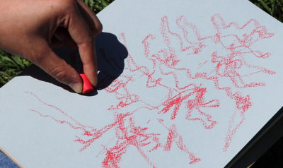 Shown is a plein air drawing session on site using soft pastels, a trip to the grocery store to buy unusual looking produce, and finding tiny plants to be references for trees and landscapes.