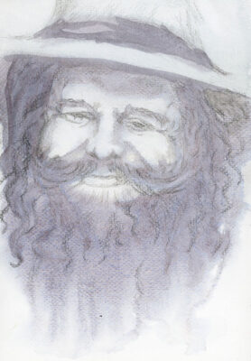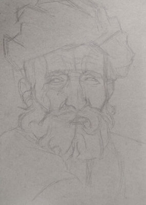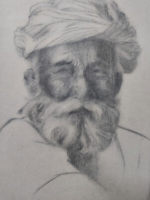 Initial layers established with vine charcoal and some final touches with compressed charcoal. Portrait is of a Rajasthani man with turban and short kept beard.”
