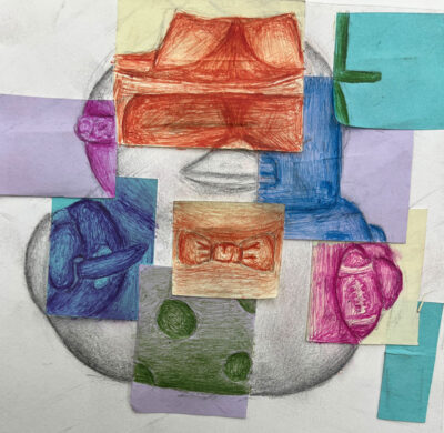 Collage pieces also included text written using India ink on tissue paper which forms her clothing. Bricks were formed by carving out bricks into a rubber Stamp and stamping on to the post its and then going over with a variety of different mediums.