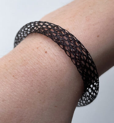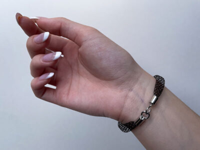 This bracelet is inspired by human hair jewelry popularized in the Victorian era. This type of table hair braiding is often referred to as hairwork or “memento mori.”