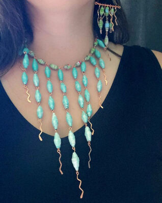 I wanted to challenge myself to try something new. The pieces include handmade paper beads with hammered copper inspired by a recent trip to Niagara Falls.