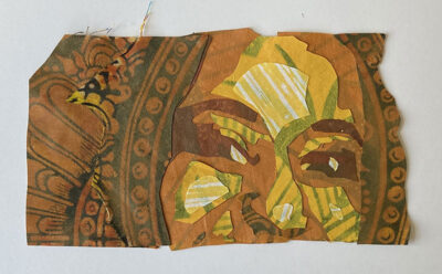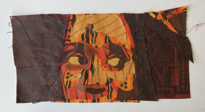 I took photos taken of me and cropped them to focus on my eyes and eyebrows. I simplified the photos to just four values each. Then I used acrylic paint to recolor scrap fabrics from previous sewing projects in each of the four values.