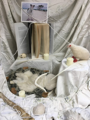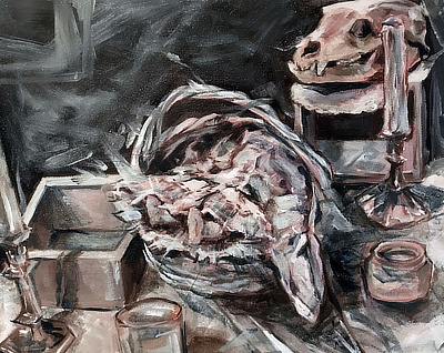 “When I was organizing the objects to use, I came up with the idea to make a coltish scene that includes the body of a girl and the bones of the beast that killed her. This painting in was especially interesting because I had to figure out a balance between the lightness of the objects in the still life and the dark theme I wanted to convey.”