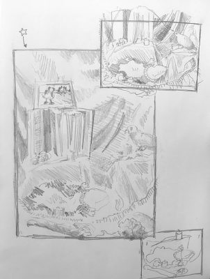 On a large piece of Bristol board, using a pencil, loosely sketch the composition of your photo. Block in all the walls, floor, ceiling, and large objects, and don’t worry about details.