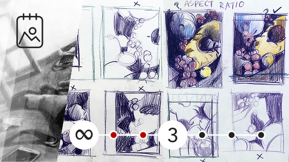 Prompt Make a viewfinder by cutting a rectangular window into a piece of cardboard. Walk around your living space, looking through the window to find “scenes” that interest you. Play with getting up close vs standing further back, and aim for a broad variety of scenes. Goal Create twelve thumbnail sketches based on the areas […]